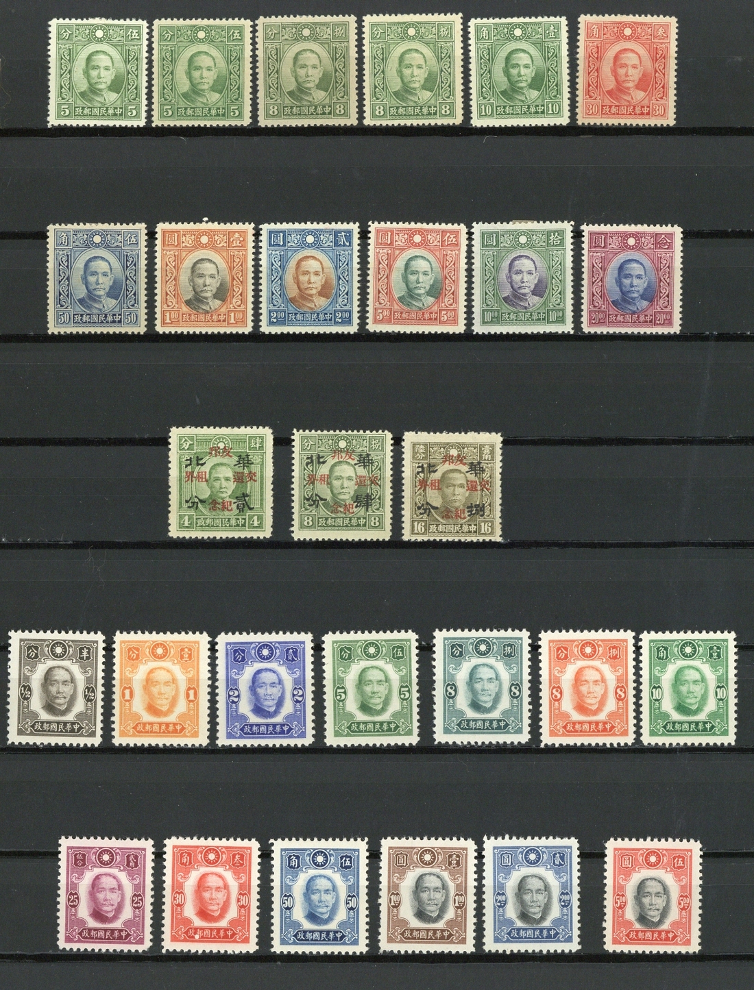 An unused selection of middle period issues which includes 1938-41 die III values to $20, 1941 Thrift set to $1 on imprint blocks of four plus blocks of ten, 1942-45 Paicheng imperf. set of seven in blocks of four, $5 roulette block of four, 1944 War Refugees Fund set in blocks of four plus the miniature sheet plus air mails and others. A good lot in fine condition. (264)