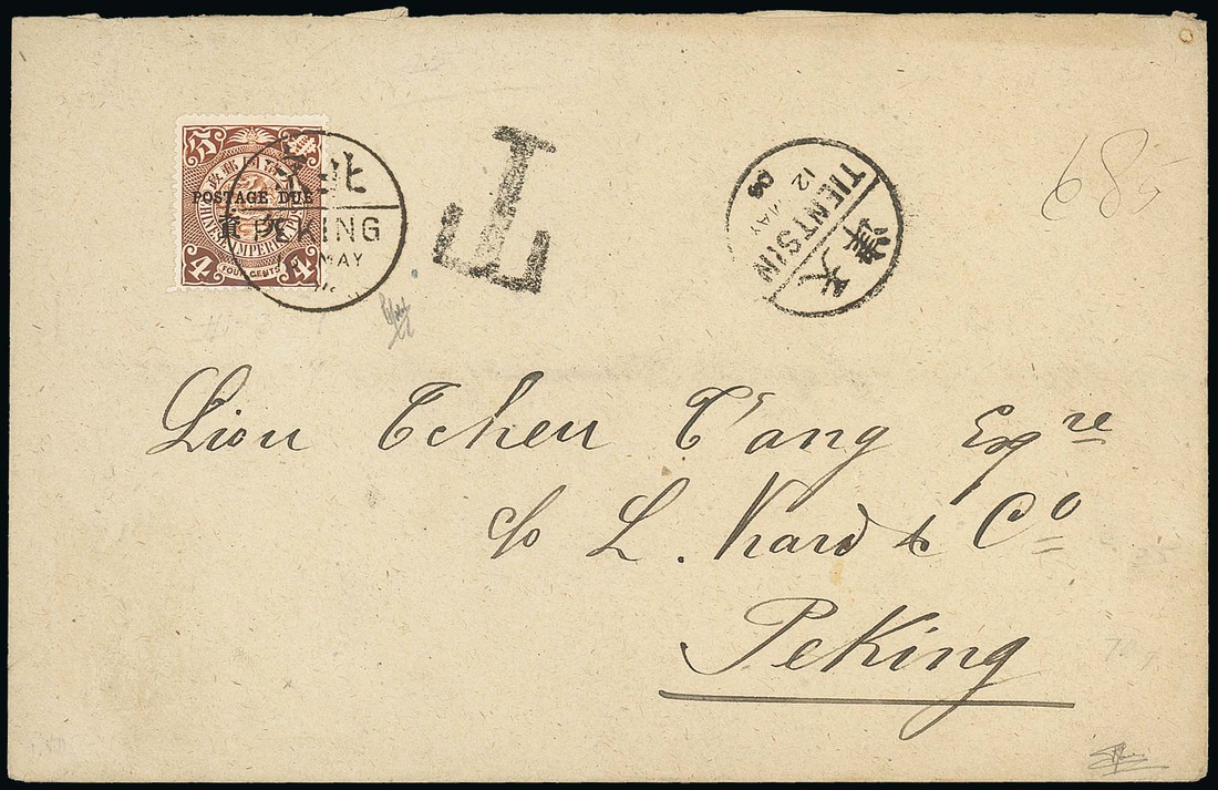 1904 (12 May) envelope posted unpaid, from Tientsin to Peking, taxed by 1904 4c. brown Postage Due with Peking cancellation of 13 May; fine. Photo