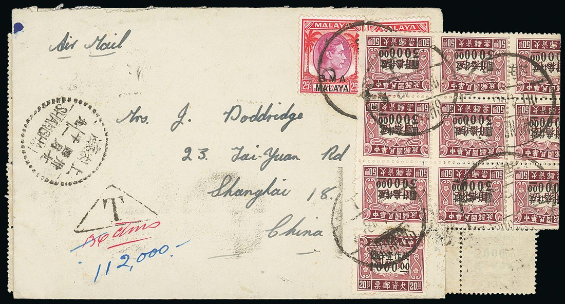 1948 (10 Apr.) air mail cover from Singapore bearing "B.M.A." 25c. pair tied by the despatch c.d.s., underpaid and with handstruck "T" in triangle with manuscript "36 cms" in red in and the Chinese currency conversion of "112,000" and bearing 1948 Postage Dues with $3000 (37) covering the back of the envelope and overlapping the side plus $1000, all cancelled by Shanghai c.d.s. A dramatic inflation cover. Photo