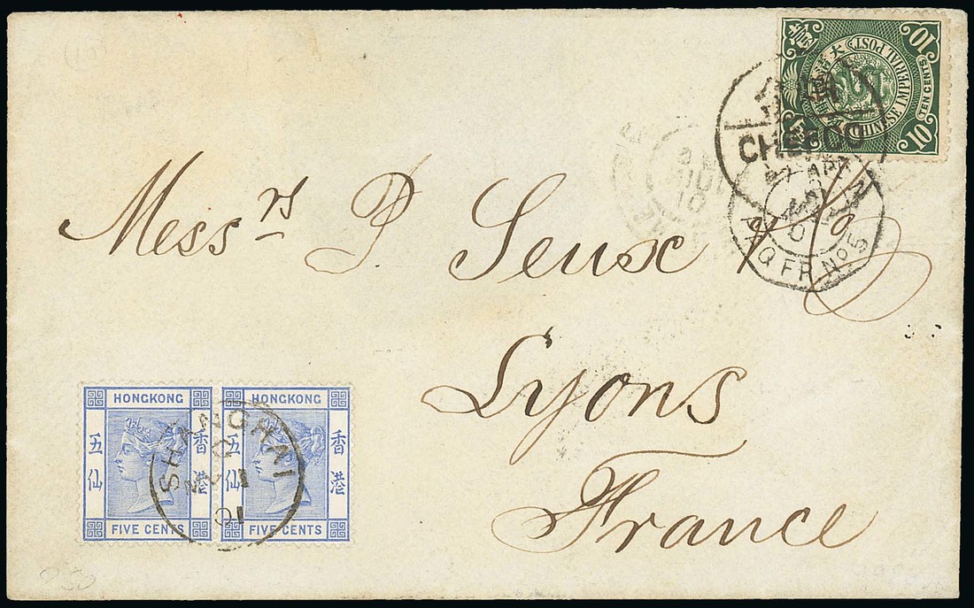 Chefoo: 1901 (27 Apr.) envelope to Lyons, France bearing C.I.P. 10c. green tied by Chefoo bilingual c.d.s. and French packet boat datestamp, with pair of Hong Kong 5c. blue just tied by Shanghai c.d.s. (1.5); the reverse with Shanghai bilingual c.d.s. and Lyon arrival. Part of the flap has been cut off. Attractive. Photo