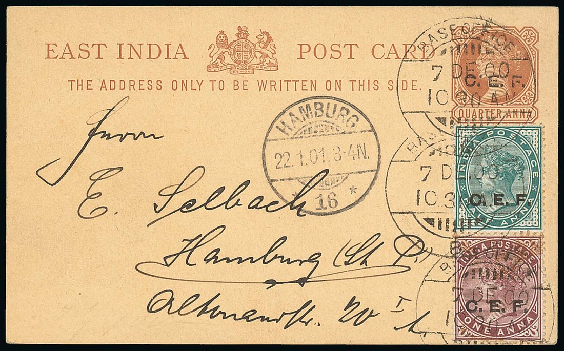 Chinese Expeditionary Force: 1900 (7 Dec.) ¼a. brown stationery card updated with ½a. and 1a. tied by fine strikes of the large Base Office/B c.d.s. of Tientsin (type 15), to Germany with Hamburg arrival alongside. Extremely clean and fine. Photo