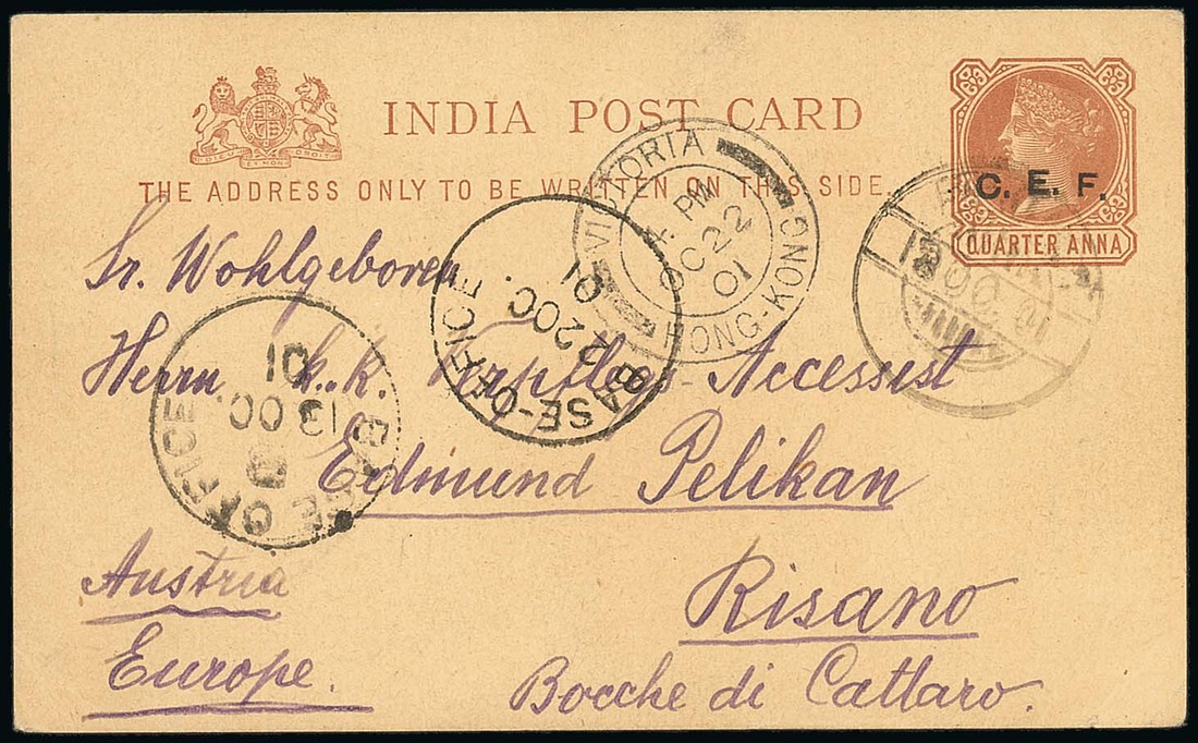 Chinese Expeditionary Force: 1901 (13 Oct.) ¼a. brown stationery card to Austria cancelled by indistinct F.P.O. c.d.s. (number unclear) but sent from Peking; with Base Office, Hong Kong and Risano c.d.s. Clean and fine. Photo