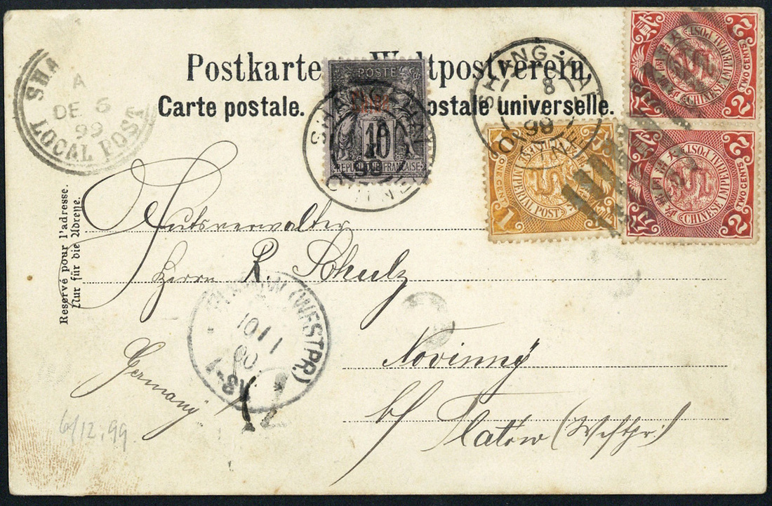 Shanghai: 1899 (6 Dec.) picture post card of the Iltis monument, to Germany, bearing C.I.P. 1c. and 2c. (2) tied by pa-kua, with France "Chine" 10c. tied by Shanghai c.d.s., with Shanghai local post and arrival c.d.s. (10.1) alongside; a few small marks