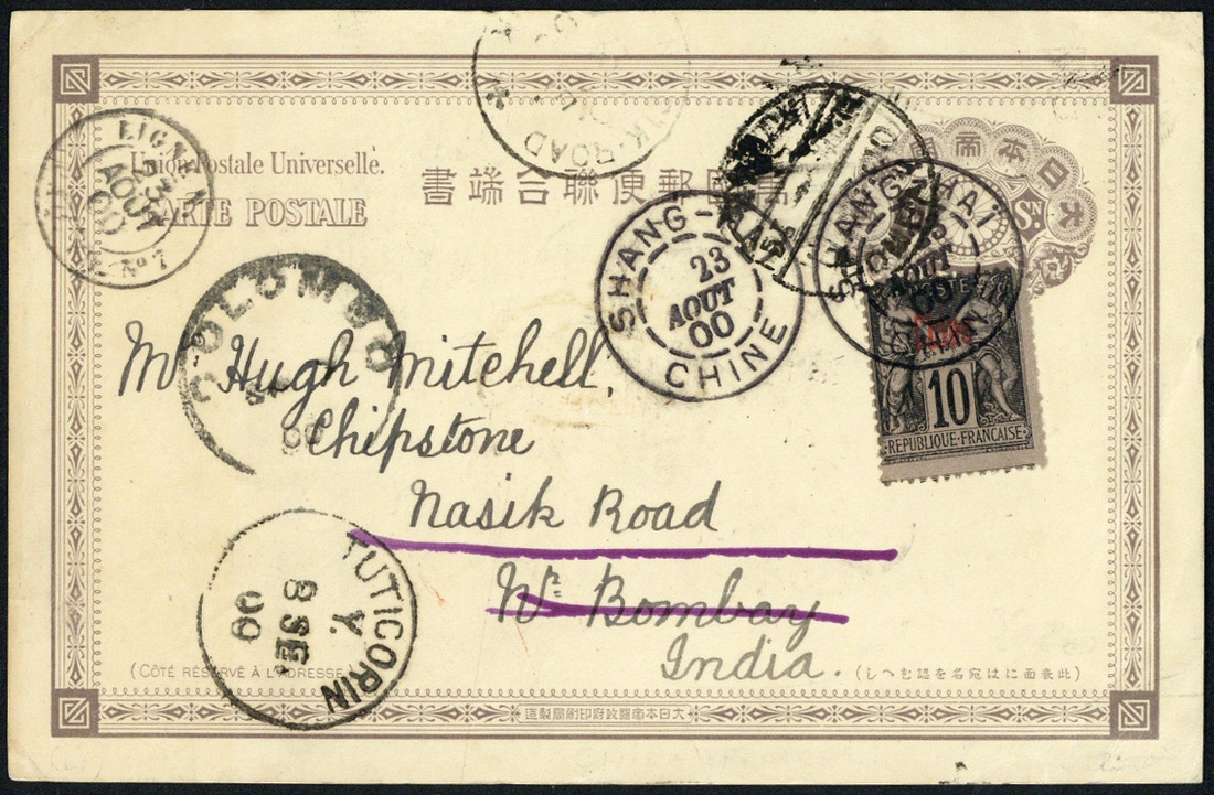 1900 (23 Aug.) Japanese postal stationery card to India, additionally franked 1894-1903 10c. with Shanghai cancellation, a variety of transit and arrival markings; the card with corner bend, fine