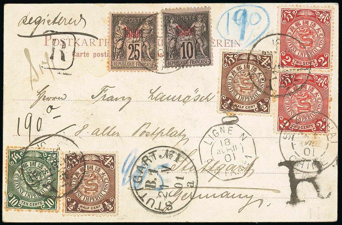 Shanghai: 1901 (17 Apr.) picture postcard registered to Germany bearing C.I.P. ½c. (2), 2c. (2) and 10c. ited by bilingual c.d.s. with French "Chine" 10c. and 25c. tied by Shang-hai c.d.s., both types of registered "R", "ligne n/paq.fr.no.1" (18.4) and Stuttgart arrival. (21.5); the card with heavy corner crease. An attractive and scarce registered card. Photo