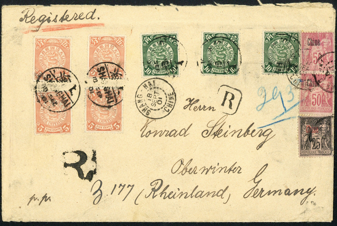 Shanghai: 1901 (18 Sept.) large envelope registered to Germany bearing C.I.P. 5c. (4) and 10c. (3) tied by Shanghai bilingual c.d.s., with French "Chine" 25c. and 50c. (2) tied by Shanghai c.d.s., with Chinese and French registration "R" handstamps; the reverse with Shanghai bilingual and Oberwinter arrival c.d.s. Minor soiling