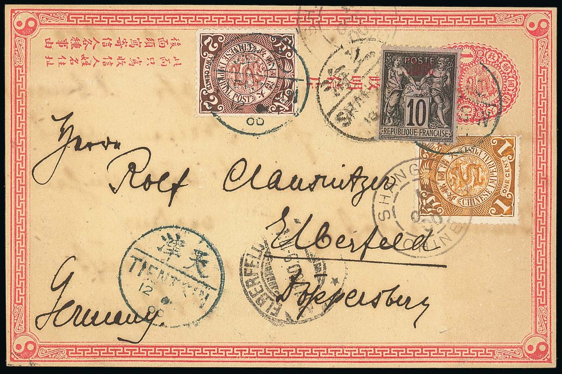 1900 (11 Oct.) 1c. postal stationery card to Germany, additionally franked coiled Dragon 1c., 2c. and French Post Offices 1894-03 10c., Tientsin and Shanghai cancellations; corner crease and a little stained though a fine Boxer rebellion card. Photo
