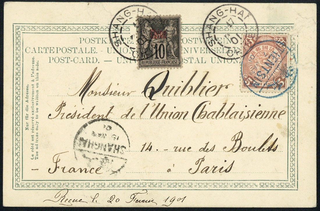 1901 picture post card (Peking, Legation Street) to Paris, franked Coiled Dragon 5c. and French Post Offices 1894-1903 10c., Tientsin and Shanghai cancellations; the card with minor scuffs and stains, fine