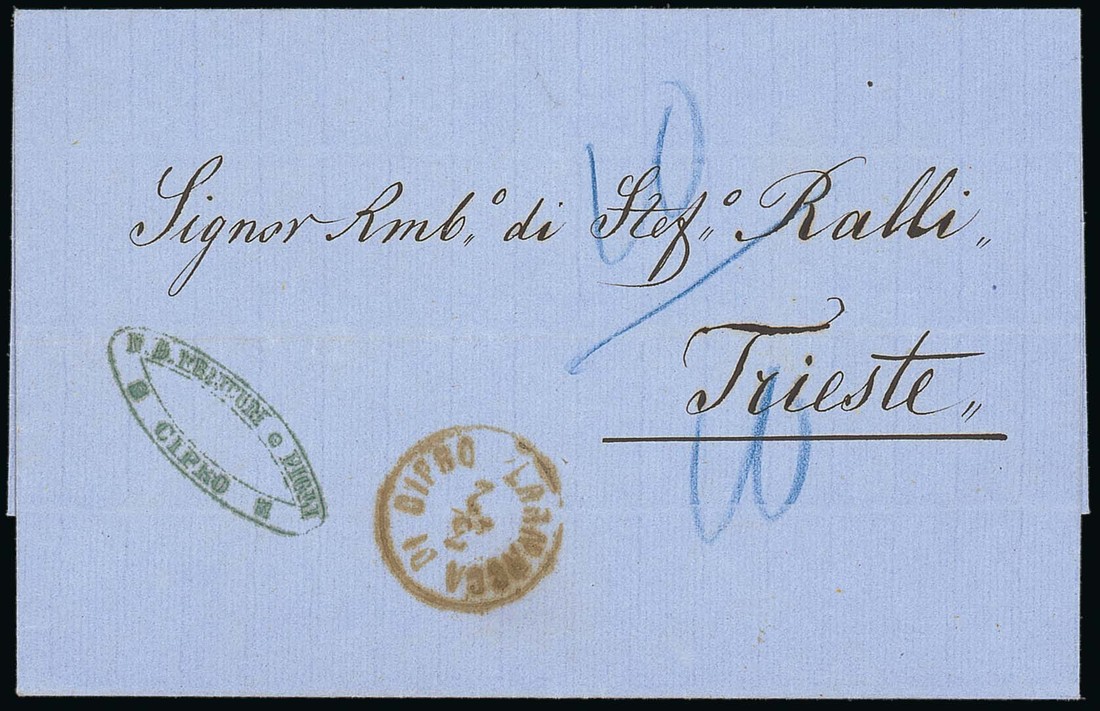 1868 (3 Feb.) entire letter to Trieste, showing senders cachet, manuscript "10/10" rate marking and with a fine strike of the "larnaca di cipro" c.d.s. in brownish ink, arrival datestamp (21.2) on reverse. Photo