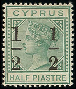 1886 (June) fractions 8mm. apart, CA ½ on ½pi. emerald-green, variety large "1" at left, unused with part original off-white gum, good colour. A fine example of this rare stamp. R.P.S. Certificate (1959). S.G. 29a, £4,000. Photo
