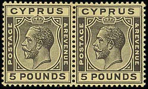 1928 £5 black on yellow horizontal pair, fresh mint, good colours and a very rare multiple. S.G. 117a, £7,500. Photo