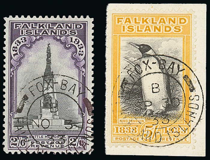 2/6d. and 5/-, both used with Fox bay c.d.s., the latter on piece; fine. S.G. 135, 136, £1,900. Photo