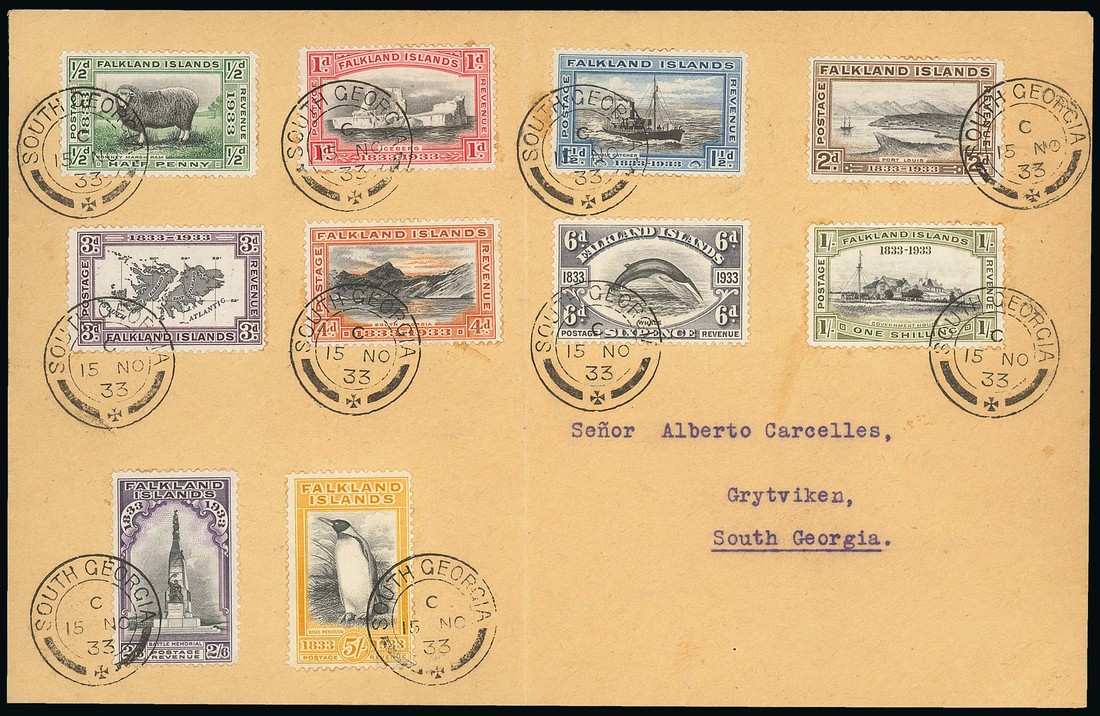 5/- black and yellow-orange used with a short set of ten tied by neat South Georgia c.d.s. on local envelope; vertical folding crease clear of the adhesives, fresh. R.P.S. Certificate (1990). S.G. 127-136a, £4200. Photo