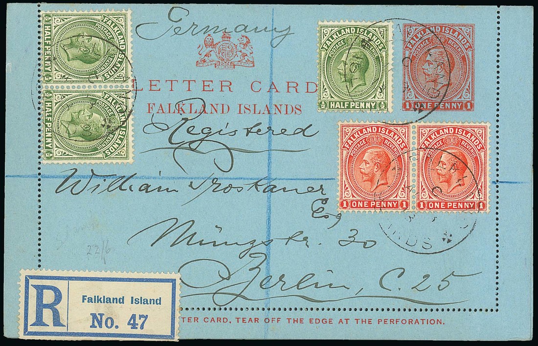 1913 (Aug.) 1d. letter card, uprated with ½d. (3) an 1d. (2), registered to Germany, all cancelled by "falkland/islands" double-ring datestamp, London (27.9) and Berlin (29.9) datestamps on reverse; fine and scarce. Photo