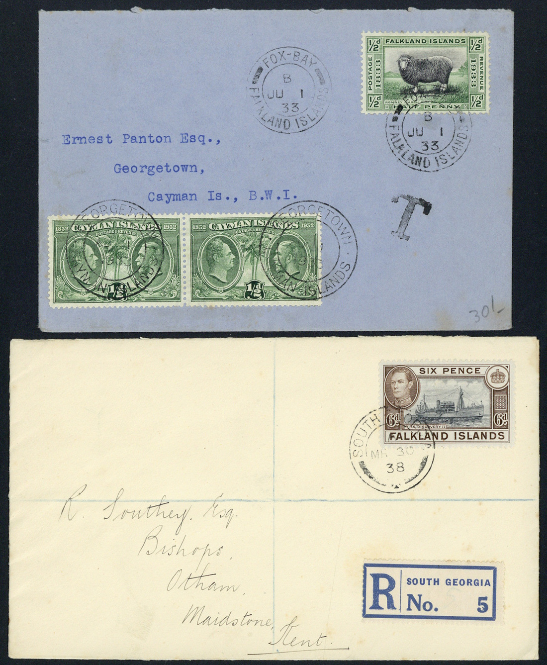 A selection with Fox Bay c.d.s. on a range of values including 1933 3d. and 4d., 1952 set less a couple of lower values (on pieces), 1933 Panton taxed cover to Cayman Islands and 1935 Silver Jubilee set in blocks of four on pieces and a set on envelope to Port Stanley; New Island on four loose KEVII/KGV values (one a complete strike on piece), and South Georgia small part strikes on 1933 2d. and 1/- on pieces, and 1938 envelope registered to England