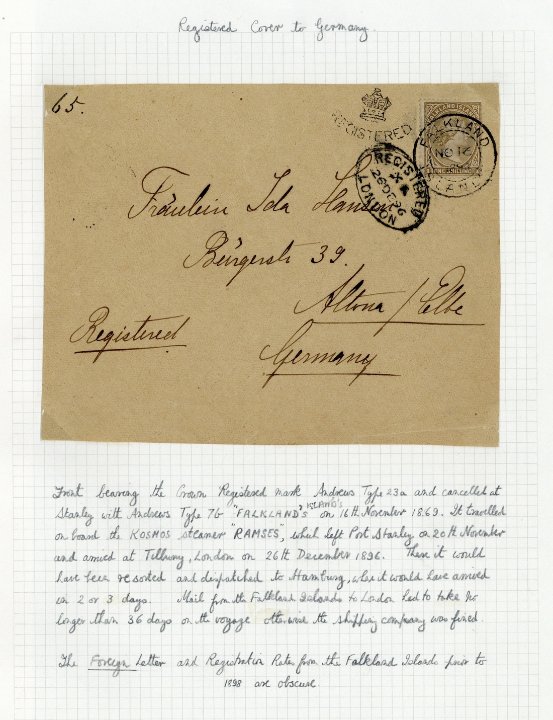 1896 front registered to Germany bearing 1878 1/- bistre-brown with double-ring datestamp, "Crown/registered" handstamp and London Registered oval datestamp alongside, 1891 piece bearing ½d. on half 1d. with cork cancellation, and 1897 G.B. 1d. reply card from Kendal to Port Stanley (requesting to purchase postage stamps) with arrival c.d.s., turned and with the reply portion sent back on 7 May with despatch c.d.s.