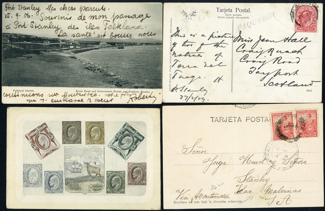 1906-09 postcards (3) from Falkland Islands bearing G.B. 1d. with different "paquebot" handstamps, 1903 postcard from England and 1905 postcards (3) from Argentina, all to Port Stanley with arrival c.d.s., 1909 Panorama postcard to U.S.A. with "forwarded" handstamp, and unused postcards (4, one published by Hartly showing Falkland Island stamps, U-18-u)