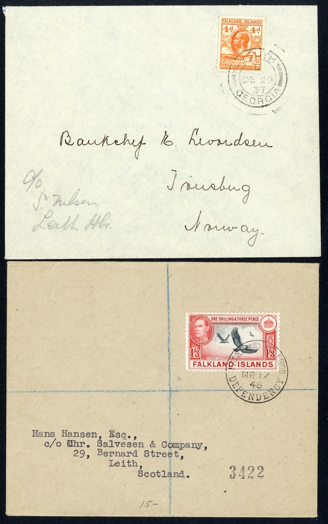 1933-48 South Georgia selection (11) with 1931 commercial to USA bearing 2½d., 1935 (2) bearing Silver Jubilee sets, 1936 to Post Stanley bearing Whale and Penguin values to 1/-, 1937 to Norway bearing 4d. orange and 1948 commercial registered to Scotland bearing 1/3d.; a couple with faults though generally fine