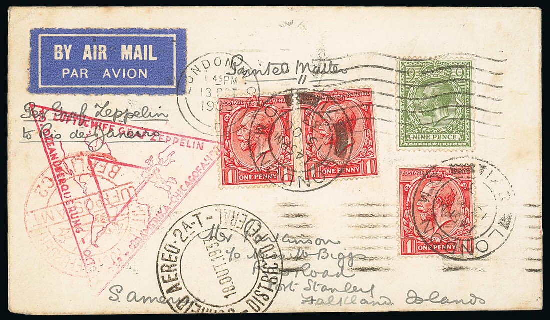 1933 (13 Oct.) Zeppelin Chicago-South America flight envelope registered from London to Port Stanley, franked at 1/- and showing triangular flight cachet, Berlin and arrival datestamps on face, large flight cachet in red and various transit datestamps on reverse; scarce. Photo
