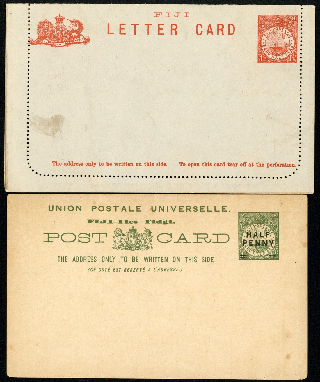 1895 1d. black (3), 1d. dark green, 1d.+1d. violet and 1½d.+1½d. brown-carmine (2), 1903 ½d. on 1d., 1904 ½d. and 1d., both overprinted "specimen", 1895 1½d. letter card, and Cook Islands 1892 1d. and 1894 1d. cards, all unused; faults in places