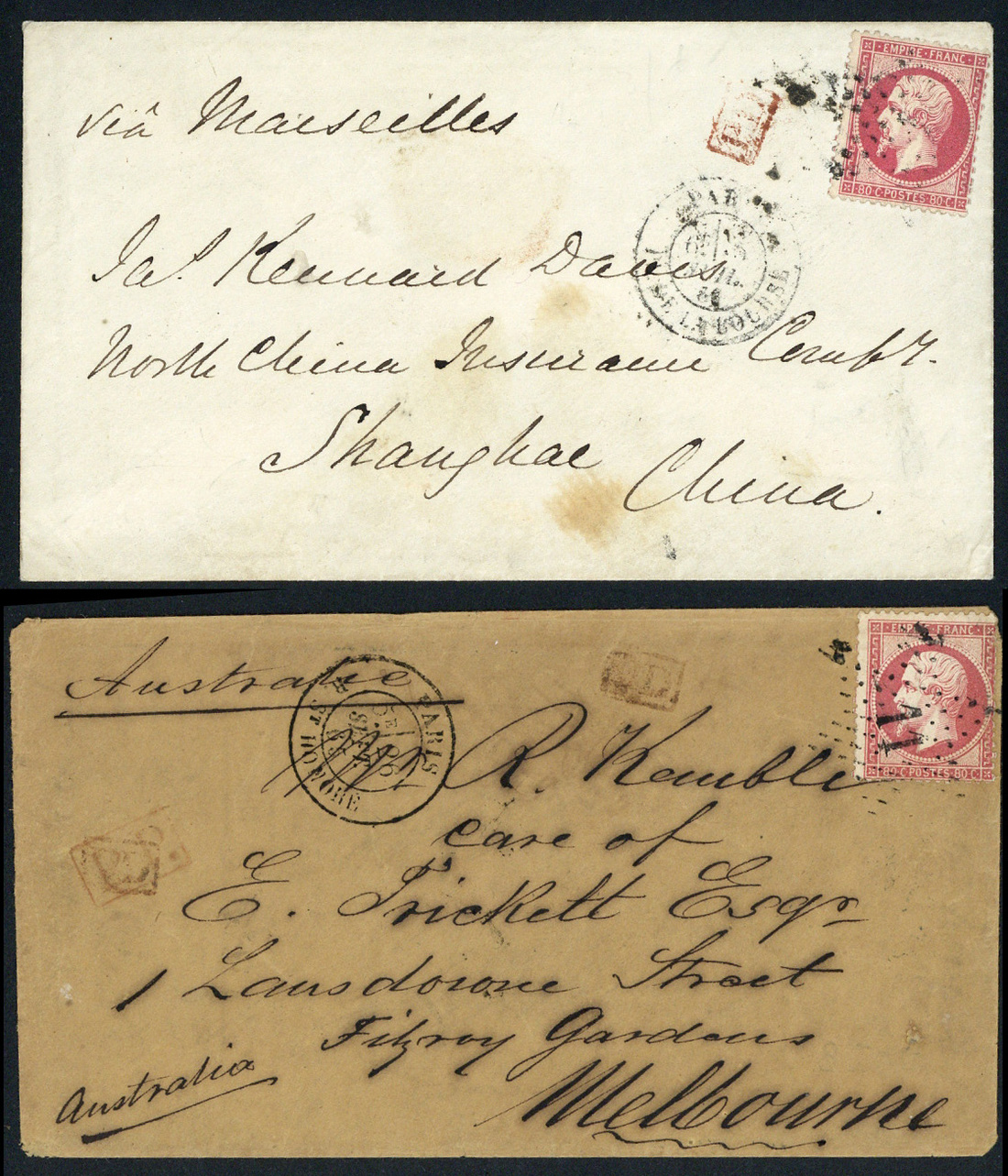 1862 80c. rose, tied by Paris star cancellation to envelope to Shanghai, red boxed "pd" on the front, also 80c. on envelope from Paris to Melbourne with arrival (19.11.65) on reverse; small faults but a scarce duo