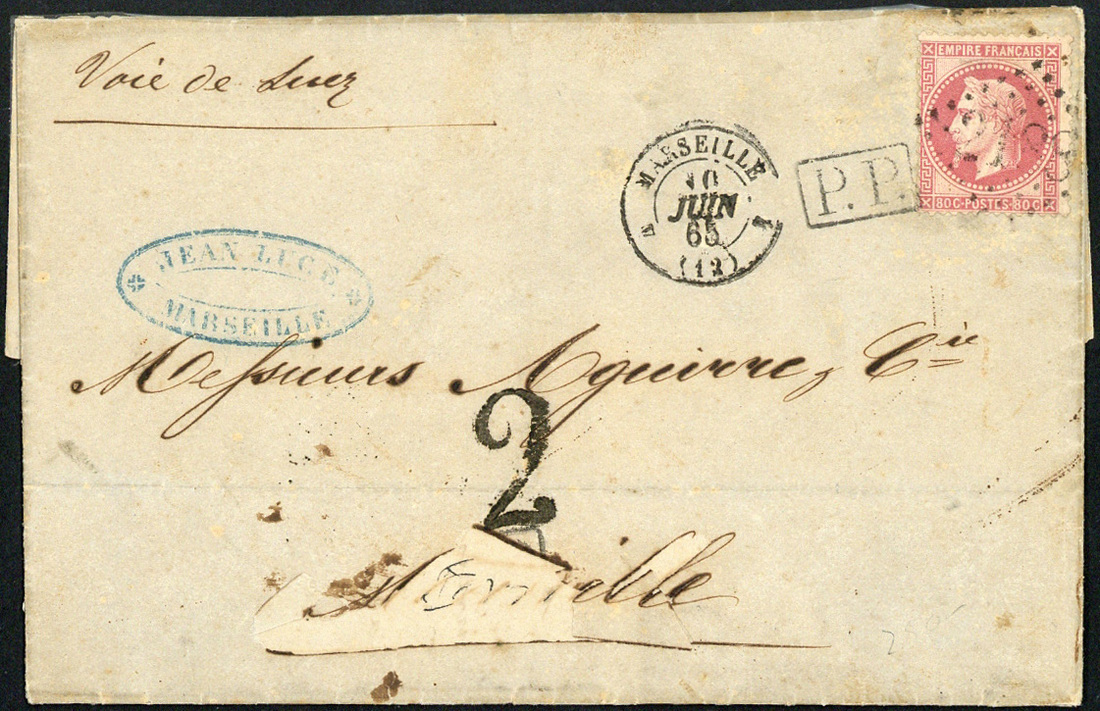 1862 80c. rose, tied by "2188" cancellation of Marseilles to entire letter, dated 10 June 1865, to Manilla, arrival datestamp on reverse across flap; faults but an extremely rare destination