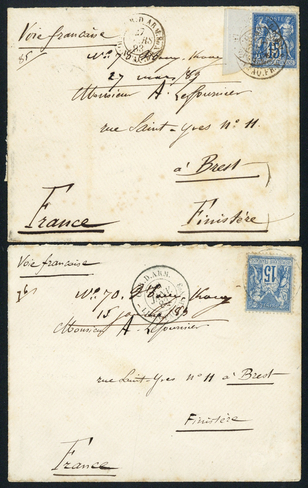 1883 two envelopes to France, ex the same correspondence, each franked Sage 15c. blue, the first with "corr.d.arm.lig.n.paq.fr no. 3/16/janv/83" cancellation (Salles 1952/3), the second with "corr d.arm lig.n.paq.fr no.8/27mars/83" cancellation (Salles 1949/8); transit and arrival markings on reverse; a little stained but a scarce pair of envelopes