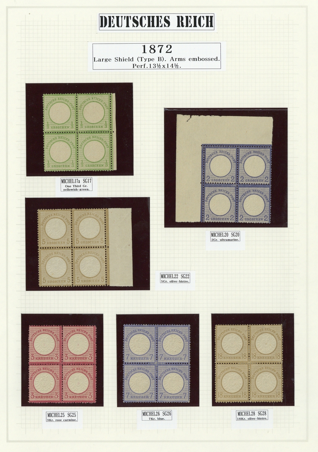 1872 Large Shield 1/3g., 3g., 5g., 3k., 7k., 18k. and 1872 "2½" on 2½g., all in blocks of four, the 7k., 18k. and "2½" on 2½g. with part original gum, the others unmounted mint, fresh colours and sharp embossing, fine. S.G. 17, 20, 22, 15, 16, 28, 29