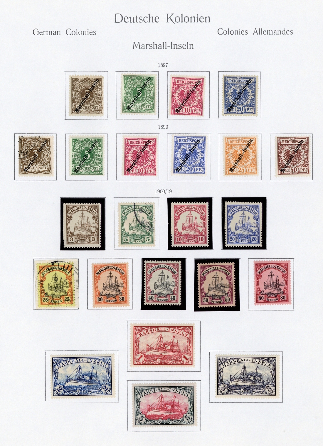 Mint and used collection (177) on pages, including Cameroun, Caroline Islands 1901-10 5m., German New Guinea 1897-99 set, 1901 5m., Mariana Islands 1899-1900 56 degree overprint set, 1901 5m., Marshall Islands 1897-1900 "Marschall" 25pf., 50pf., "Marshall" set, 1901 5m., Samoa 1900 set, 1900-01 5m., Togo 1897-98 set, 1900 5m., etc., mixed condition