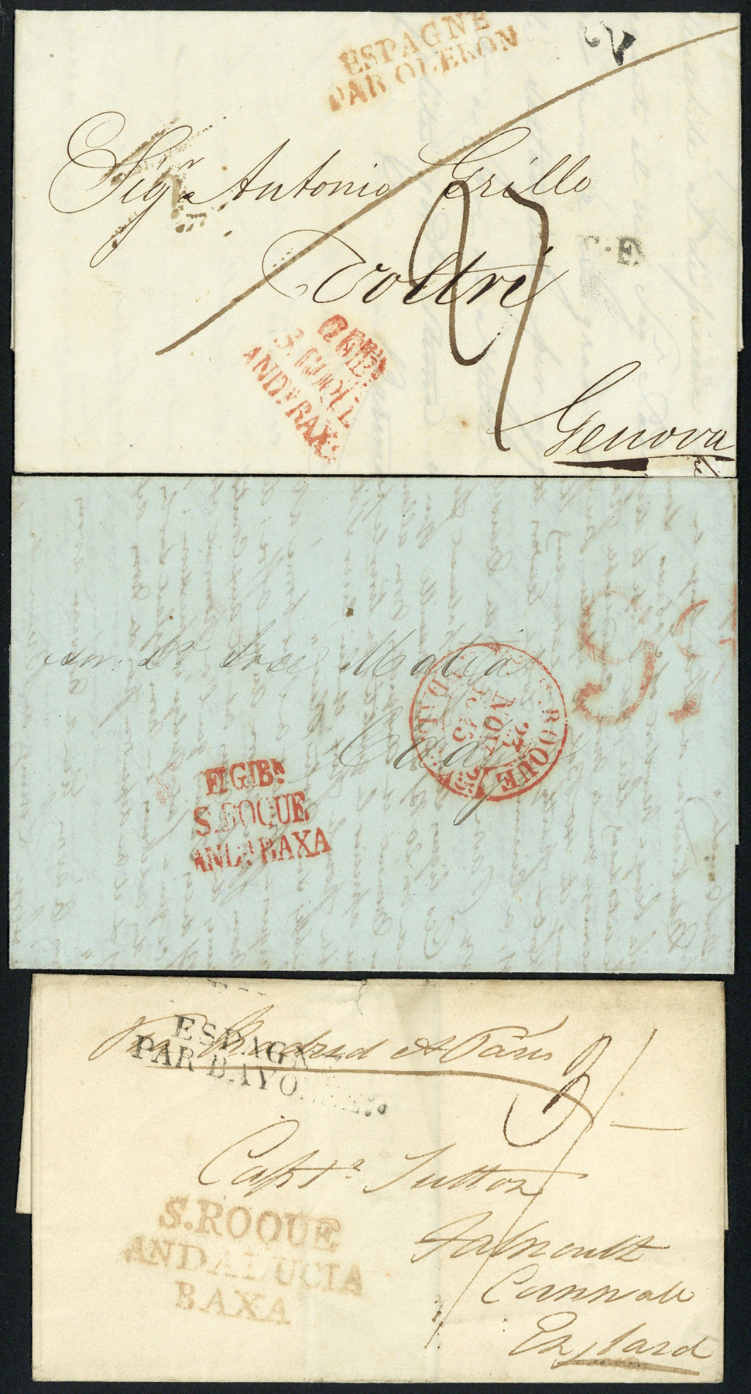 1836 (30 June) entire letter to Genoa with red "de gibr/s.roque/anda baxa" and "espagne/par oleron", also 1843 (23 Nov.) entire letter to Cadiz with red "s.roque" d.s. and "e.gibr/s.roque/anda baxa" in the same colour, also 1823 (Feb.) entire to Falmouth with red "s.roque/andalucia/baxa" which may be from Gibraltar; good to fine