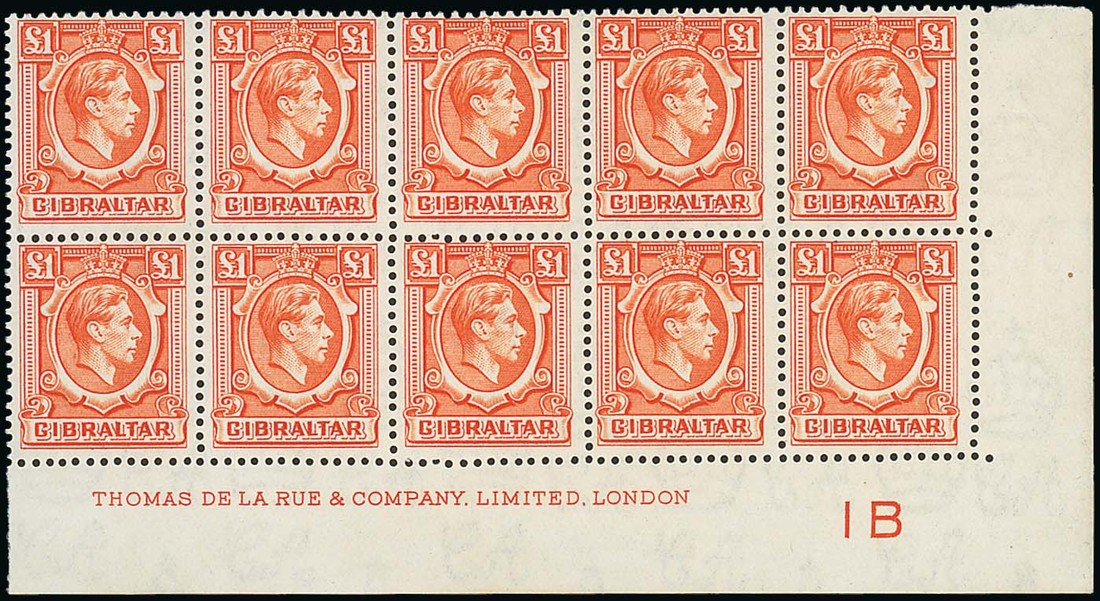 1938-51 £1 lower right corner block of ten (5x2) with imprint and plate number 1B, unmounted mint; a couple of light gum creases though of superb appearance and a scarce multiple. S.G. 131. Photo