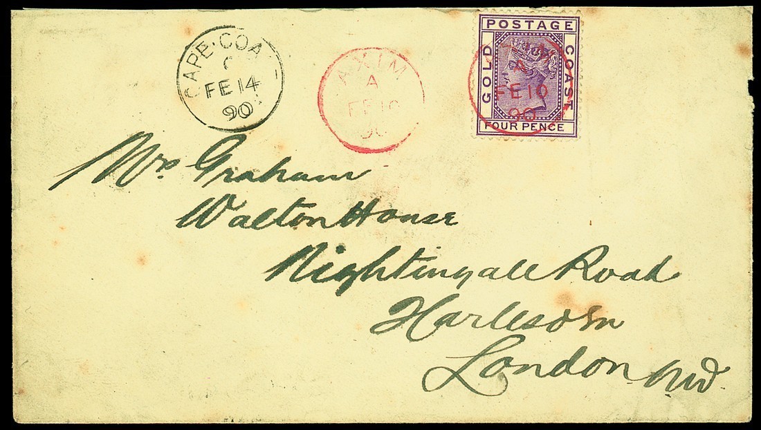 1890 envelope to London bearing 1884-91 4d. deep mauve neatly cancelled with superb "axim" Code A c.d.s. (Type 2) in red, and 1893 2d. G size registered envelope from Quittah to London bearing 1884-91 1d. rose-carmine and 4d. rosy mauve each clearly cancelled "B27." and showing "quittah" Code B c.d.s. (Type 2)