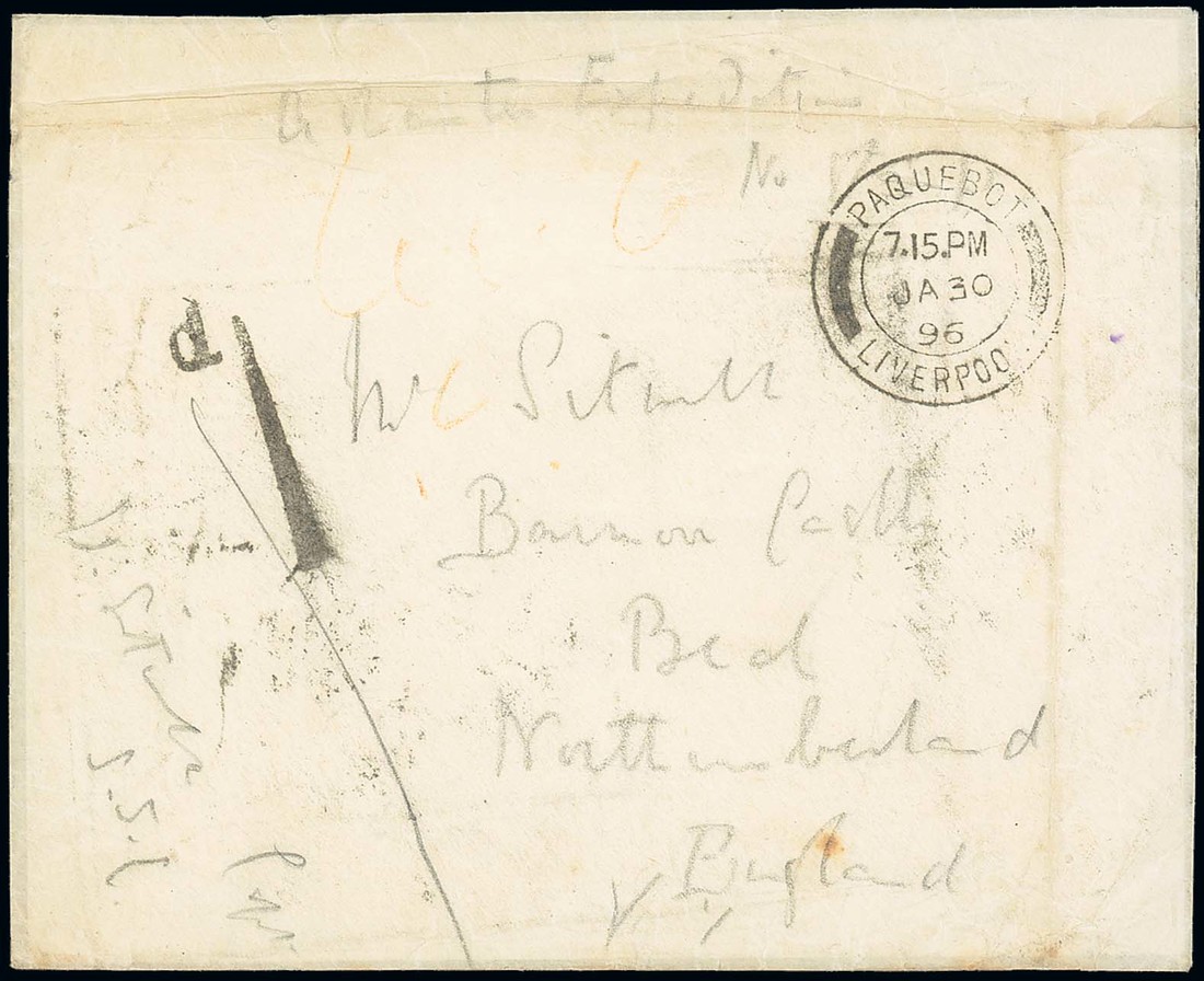 1895 (early Jan.) officer's unstamped envelope ex the Sitwell correspondence to England, marked "Ashanti Expedition No Stamps." lightly in pencil, signed by Capt. Sitwell and showing "d1" tax handstamp (applied in error as no concessionary rate was applicable to officers) and fine "paquebot/liverpool" double-ring d.s. (30.1), Deal arrival c.d.s. (31.1); some creases though a scarce item from the Ashanti Expedition. Photo