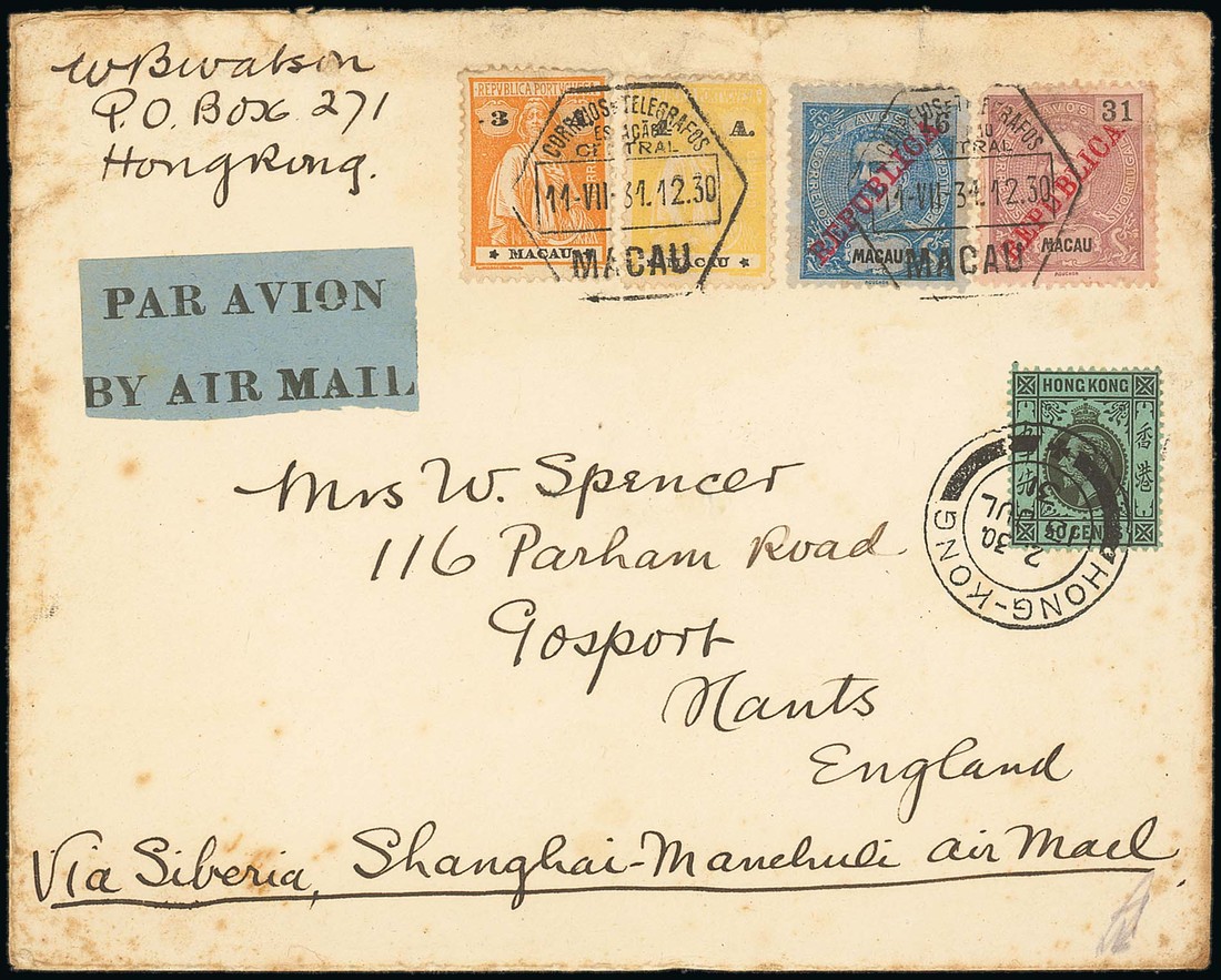 Airmail: 1931 (11 July) envelope from Macao to England "Via Siberia, Shanghai-Manchouli Air Mail" bearing Macao 54a. franking, Hong Kong 50c. tied by double-ring c.d.s. (13.7) and with "par avion/by air mail" etiquette, the reverse with Peninsular Hotel advertising stamp; a few age spots. Photo