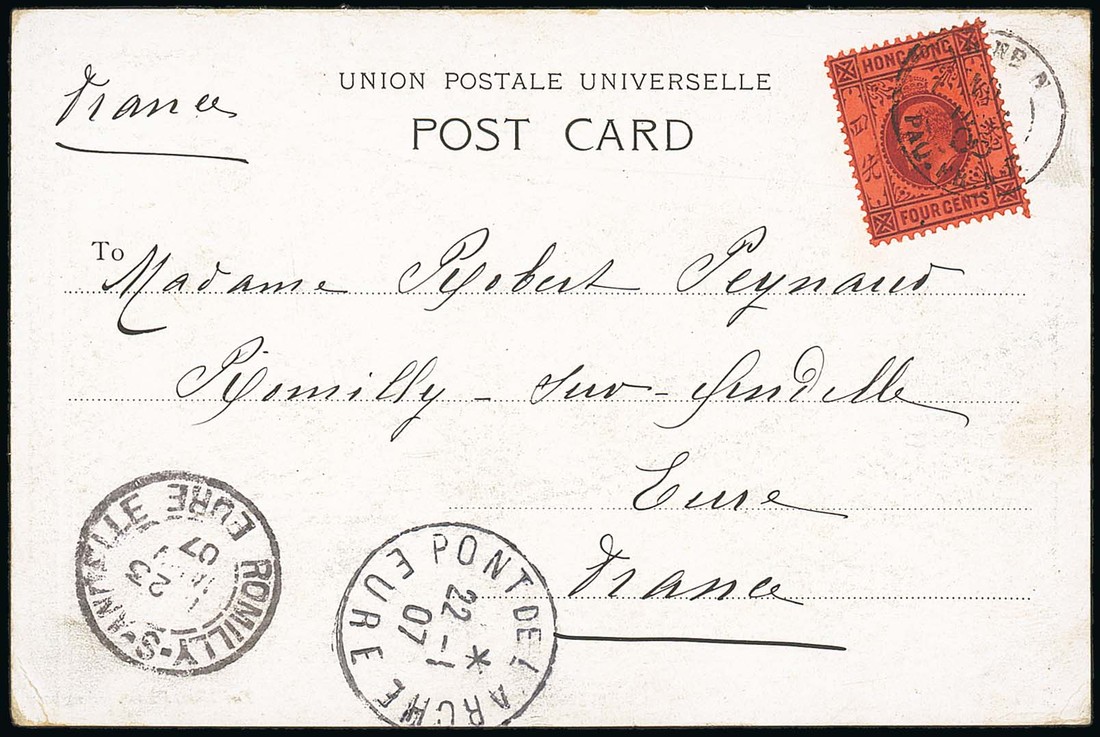 Maritime Mail: French Packet Boat; 1906 (10 Dec.) unusual picture postcard of Hong Kong bearing K.E.VII 4c. tied by circular "ligne n/paq. fr. no. " (number missing) and with two French c.d.s. in the lower corner. Fine. Photo