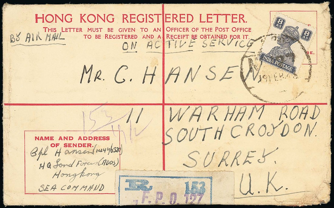 Military Mail: 1946 (19 Feb.) K.G.VI 25c. registered envelope uprated with India 8a. and (on reverse) pair of 2a. cancelled by fair strikes of the large F.P.O. No. 127 with the F.P.O. registration label folded over the foot of the cover. The cover to Croydon is marked "By Air Mail" and "On Active Service". Minor soiling but an interesting example of this forces mail. Photo