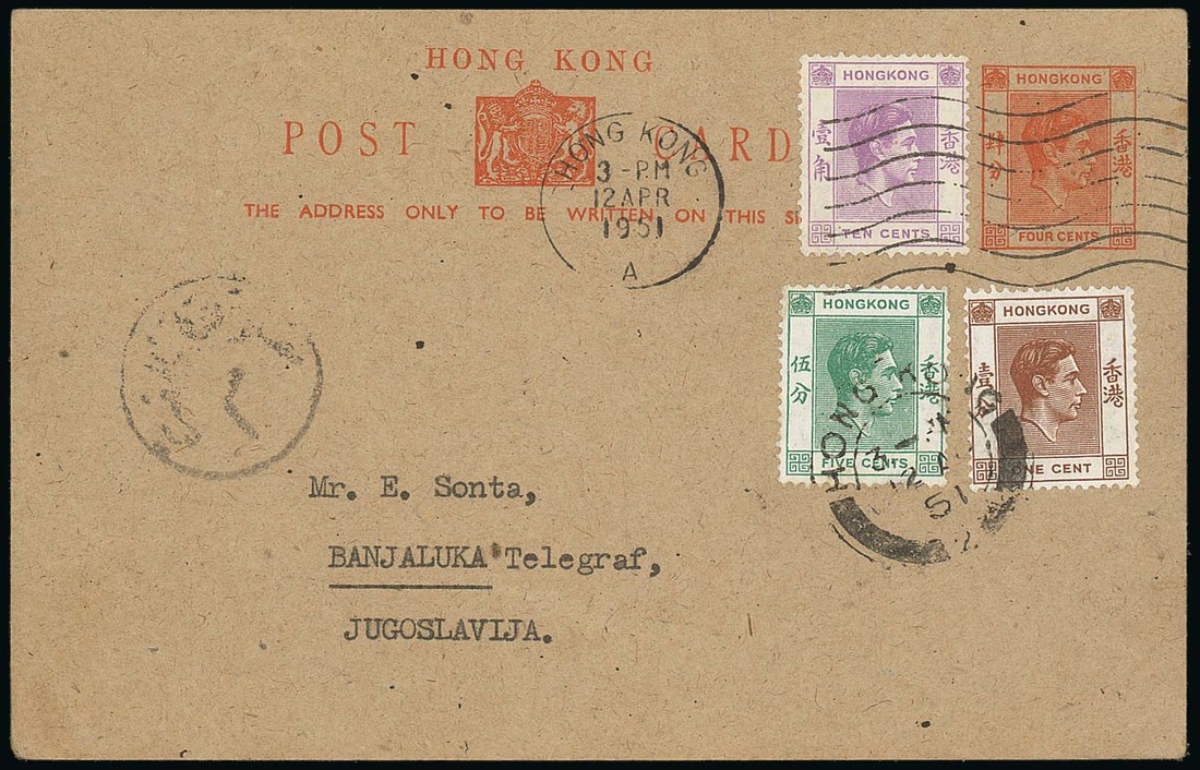 1951 (12 Apr.) 4c. orange of grey-buff card, to Yugoslavia and uprated with 1c., 5c. and 10c., with indistinct postmark at left and Cairo transit on the reverse; small corner crease. An unusual destination. Yang P40. Photo