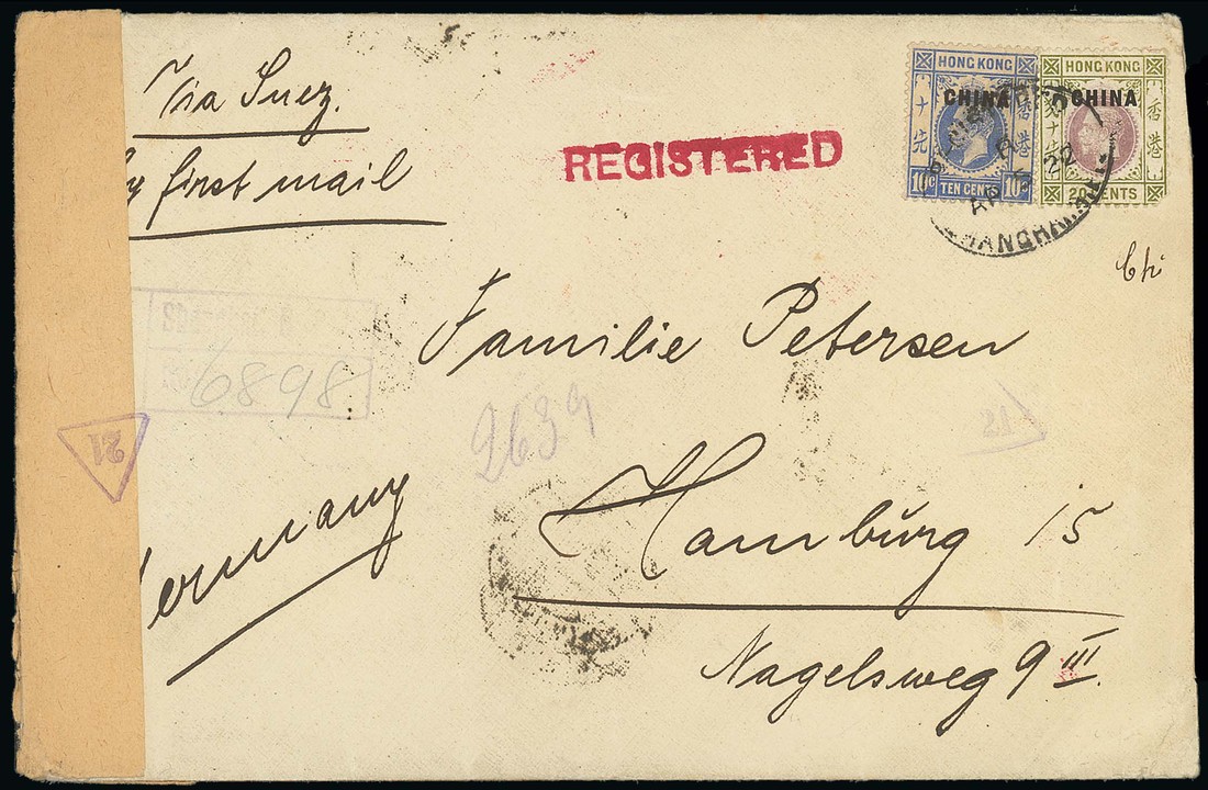 1922 (5 Apr.) envelope registered to Germany "Via Suez By first mail" bearing "china" 10c. and 20c. (short corner) tied by Shanghai registered oval, a faint strike of the very scarce "Shanghai B.P.O." boxed registered handstamp (Proud R10) in purple, with German censor seal at side and many backstamps with Alexandra, Frankfurt and Hamburg arrival. A good cover, the registration handstamp only recorded used between April and November 1922 (possibly the earliest example). Photo