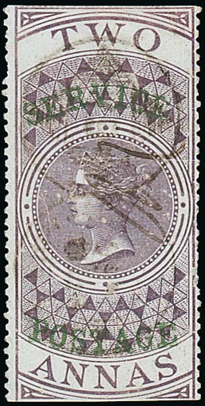 1866 (Oct.) overprinted "service/postage" 2a. purple lightly cancelled by duplex and manuscript, a few of the usual surface abrasions, and overprinted "service postage" ½a. mauve on lilac with large part "144" duplex. S.G. O16, 19, £1,150. Photo for first