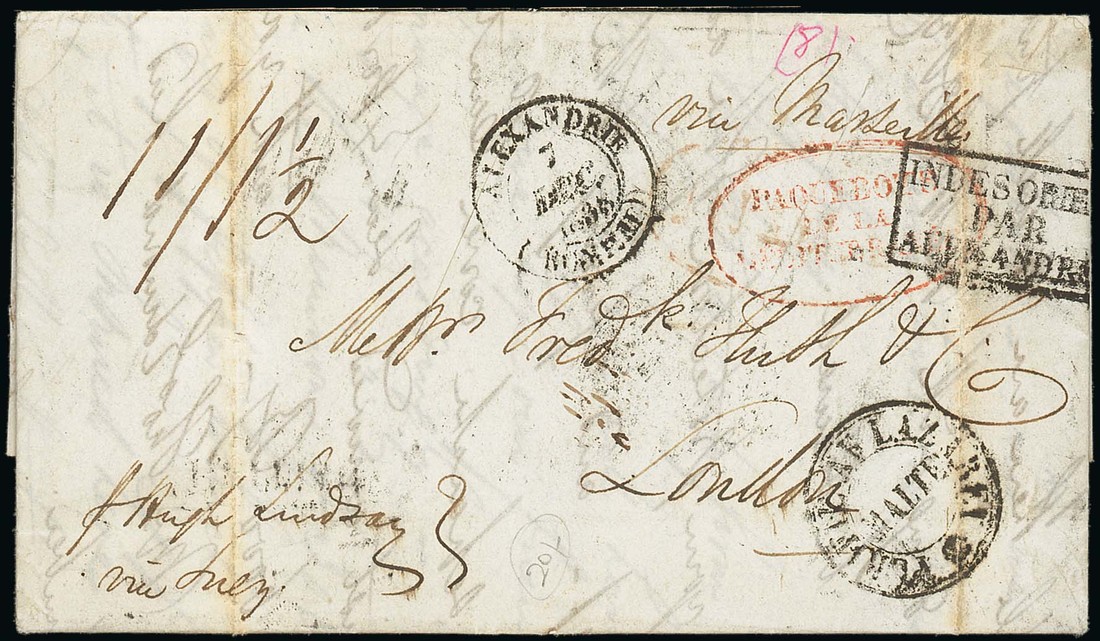 1838 (1 Nov.) entire letter from Bombay to London, endorsed Via Marseilles and p. hugh lindsay/via Suez, forwarded to Alexandria with arrival d.s (7.12) and boxed "indes orientales/par alexandrie" (struck partly over the edge, disinfected at Malta and with "purifee au lazaret/malta" and red oval "paquebots/de la/mediteranee"; filing folds and small faults on the reverse; fine. A rare entire. J. Van der Linden certificate (2011). Photo