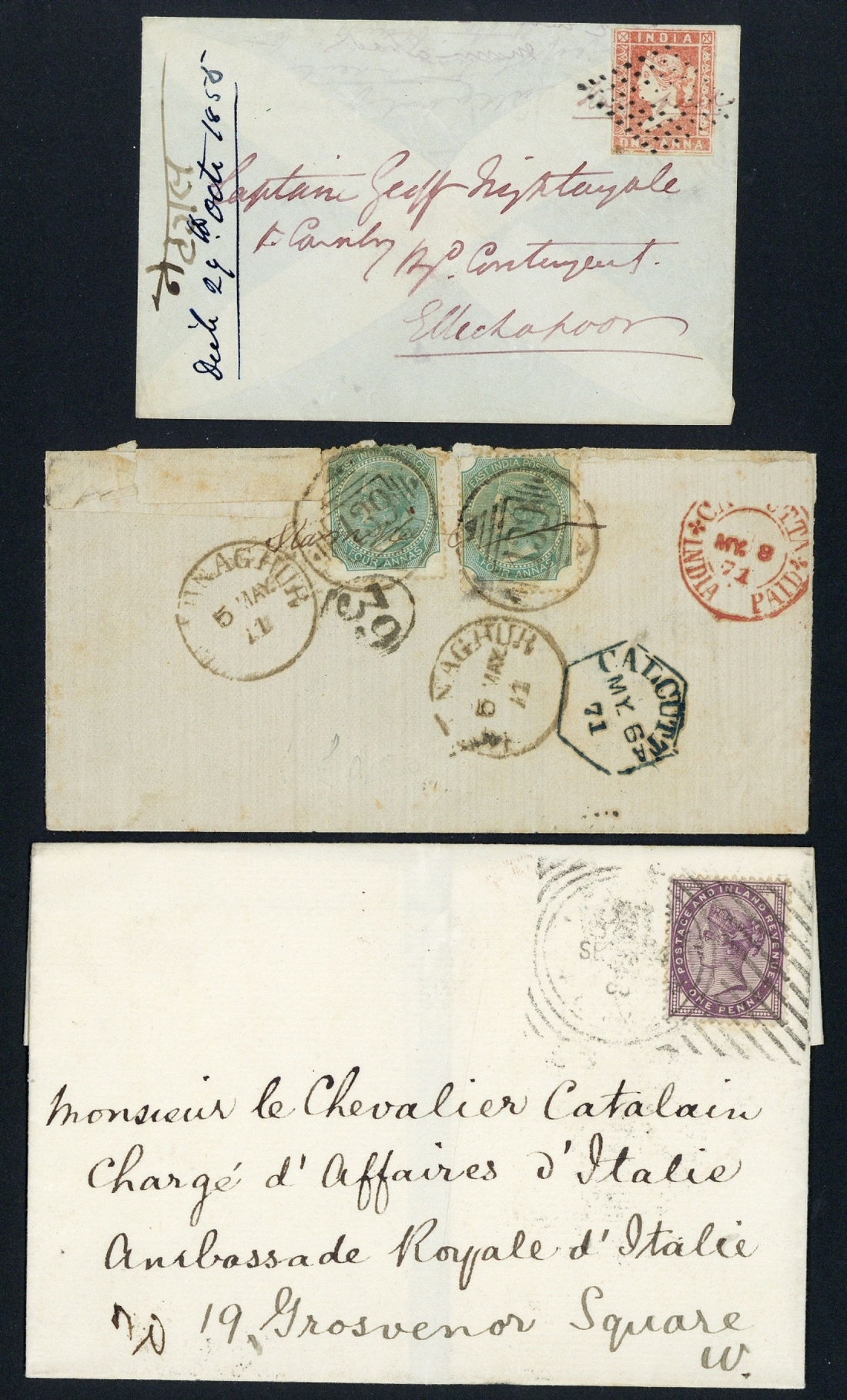 1855 (29 Sept.) envelope bearing 1854-55 1a. red with lozenge of dots and pen cancellations, on reverse red boxed mysore paid marking with date completed by hand, also 1871 entire to Milan franked 1866-78 4a. green (2) with "139" Naghur cancellations, Great Britain 1880 envelope to the Italian Embassy in London franked 1d. with Hoster experimental cancellation; mixed condition
