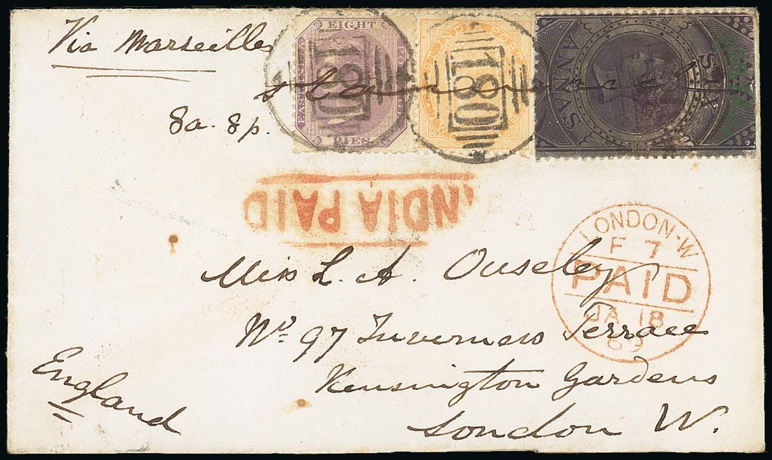1868 envelope from an unknown office "via Marseilles" to London, bearing 8p., 2a. and 1866 tall "postage" 6a. purple (all-over burnishing) cancelled by part "180" duplex with framed "india paid" and London Paid c.d.s. (18.1.69) below, the reverse with large part T.P.O. c.d.s. Photo