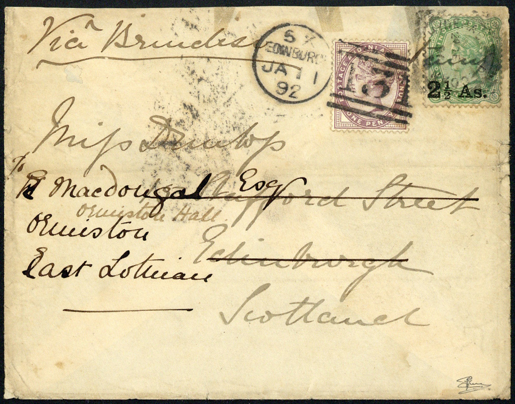 1891 (26 Dec.) envelope to Scotland franked 2½a. on 4½a. with squared circle and manuscript cancellations, redirected to East Lothian and additionally franked Great Britain 1d.; small perimeter faults and a little stained