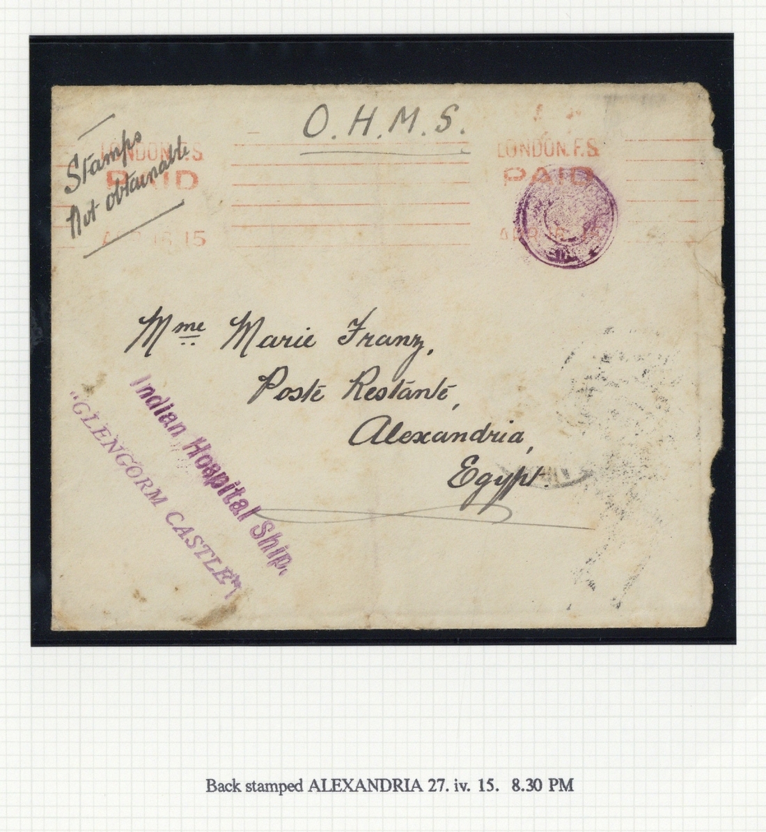 1915 and 1919 Union Castle Line crested envelopes, the first O.H.M.S. from London to Egypt, marked "Stamps not obtainable" and showing "Indian Hospital Ship/glencorm castle" handstamp and an indistinct circular intaglio seal handstamp, both in purple, the second to Egypt with "indian hospital/ship/glencorm/castle/Date" handstamp with date complete in manuscript, 1915 envelope to Lashkar showing "On Active Service/ Hospital Ship "Loyalty" cachet over-cancelled by Southampton Karg machine datestamp in red, and 1915 "On Active Service" envelope to Bombay showing "h.m.s. dufferein" cachet in violet, framed "paquebot" and censor cachet; a few small impercetions though an interesting lot