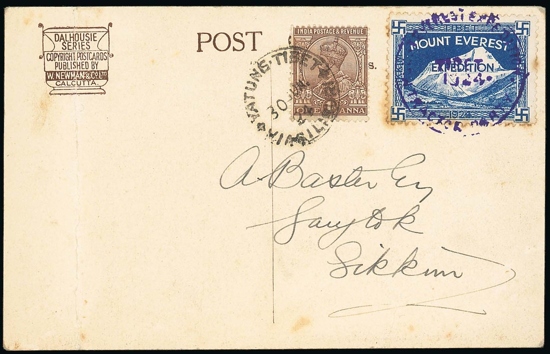 1924 illustrated postcard to Sikkim, bearing 1a. cancelled by Yatung Tibet Via Siliguri c.d.s. and bearing blue label cancelled by a legible strike of the very rare "mount everest expedition/tibet/tractor party" dated handstamp in violet; card with vertical crease at left and a little foxing around the label. Photo