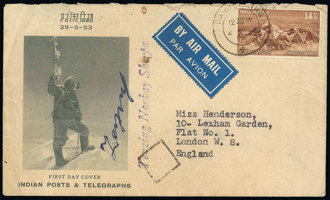 1953 (2 Oct.) envelope from Tenzing Norkay, Sherpa, complete with typed letter, to London, the letter stating that it was being postmarked on Gandhi's birthday, both the letter and envelope signed "Tenzing", 1953 (2 Oct.) illustrated "Conquest of Everest" first day cover signed "E.P Hillary" and various other items relating to the 1953 and 1965 Everest issues. Photo