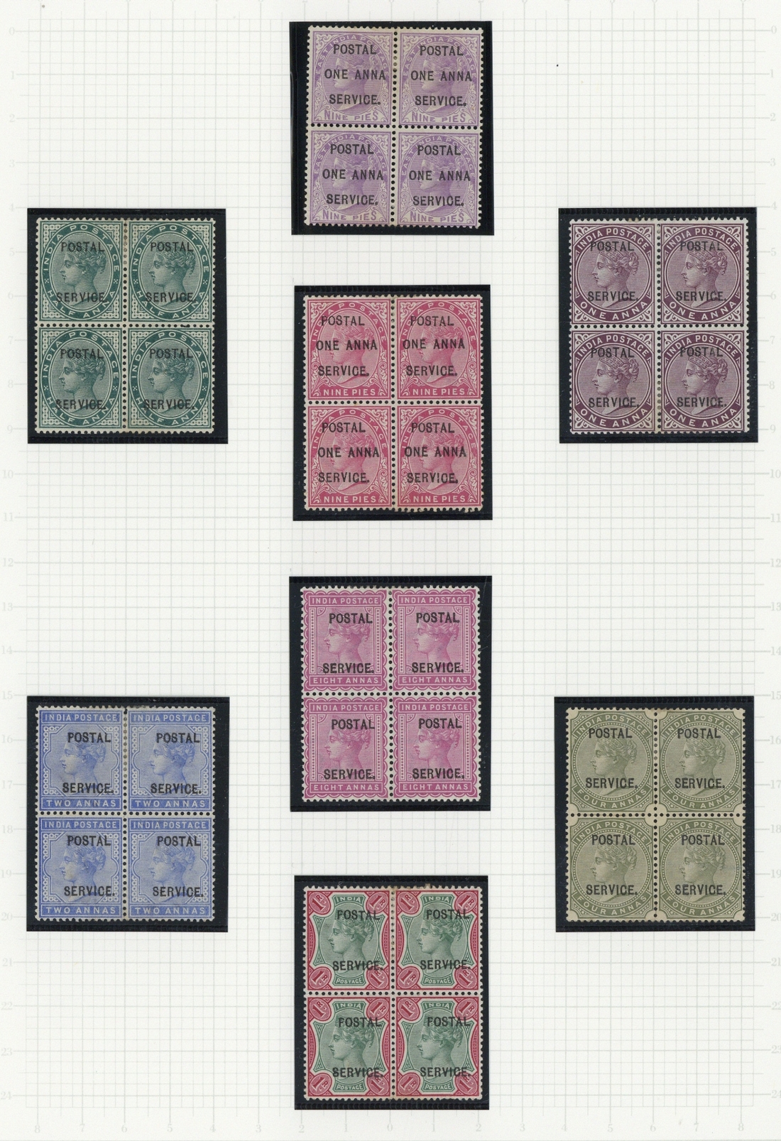 A collection (71) including QV mint and used range to 5r. (one 2a. apparently postally used), 9p. to 1r. (eight values) in mint blocks of four and KEVII used selection to 2r. (2, one showing three short letters); generally fine