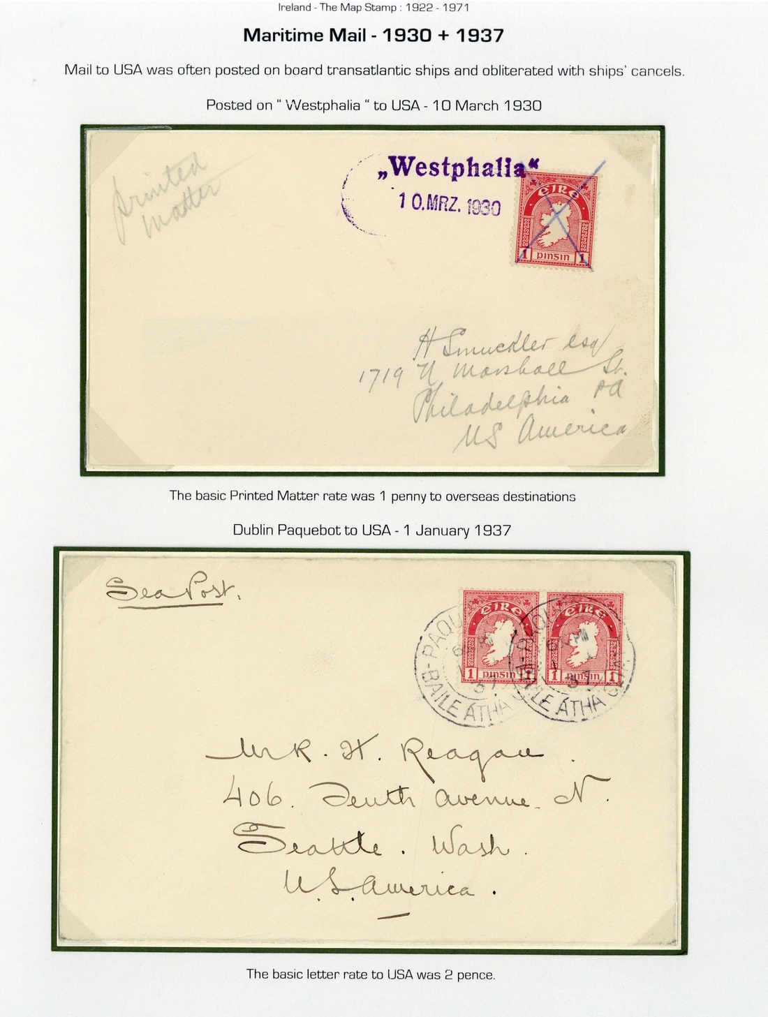 1925-37 four covers and a card, including 1925 (12 Jan.) envelope to London franked ½d., 1d., 1½d. with H & K Packet cancellations, 1927 envelope to France franked 1d., 2d. and postcard to the U.S.A. franked 2d. with "paquebot/posted at sea/received/holyhead" cancellations, 1937 (I Jan.) envelope to the U.S.A. franked 1d. (2) with Paquebot Baile Atha Claith cancellations; good to fine