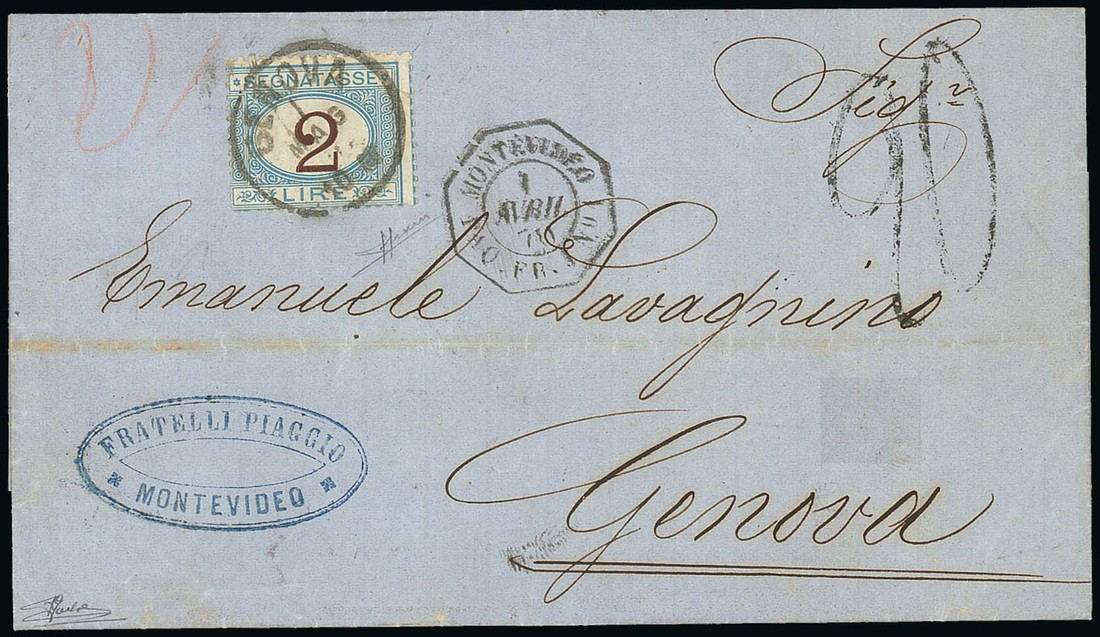 1870 (1 April) entire letter from Montevideo to Genoa, posted unpaid with octagonal "montevideo/paq.fr.j. no.1" and taxed on arrival by 2L. Postage Due with Genoa c.d.s. (1.5); horizontal filing fold clear of the stamp and markings, fine. Photo