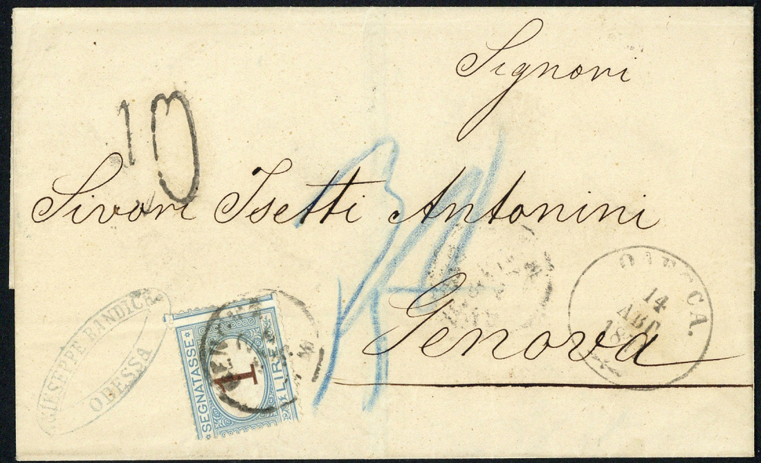 1870 (14 Aug.) entire from Odessa to Genoa, posted unpaid and taxed on arrival by 1L. Postage Due with Genoa cancellation; the adhesive crossed by light filing fold; fine